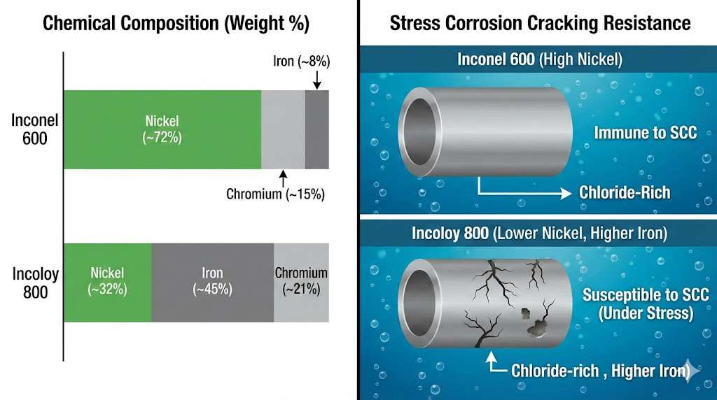 1. Corrosion and Stress Corrosion Cracking (SCC) The 72% nickel content in Inconel 600 makes it virtually immune to Chloride-Ion Stress Corrosion Cracking. This makes it the superior choice for environments containing magnesium chloride or other salts. Incoloy 800 offers moderate resistance to SCC—far better than 300-series stainless steels—but can still crack under extreme cyclic stress in chloride environments.