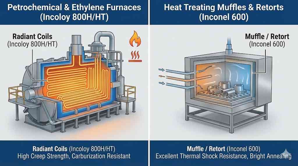 Figure 2: Typical furnace tubing applications, showing Incoloy 800H/HT in a petrochemical furnace and Inconel 600 in a heat-treating muffle.